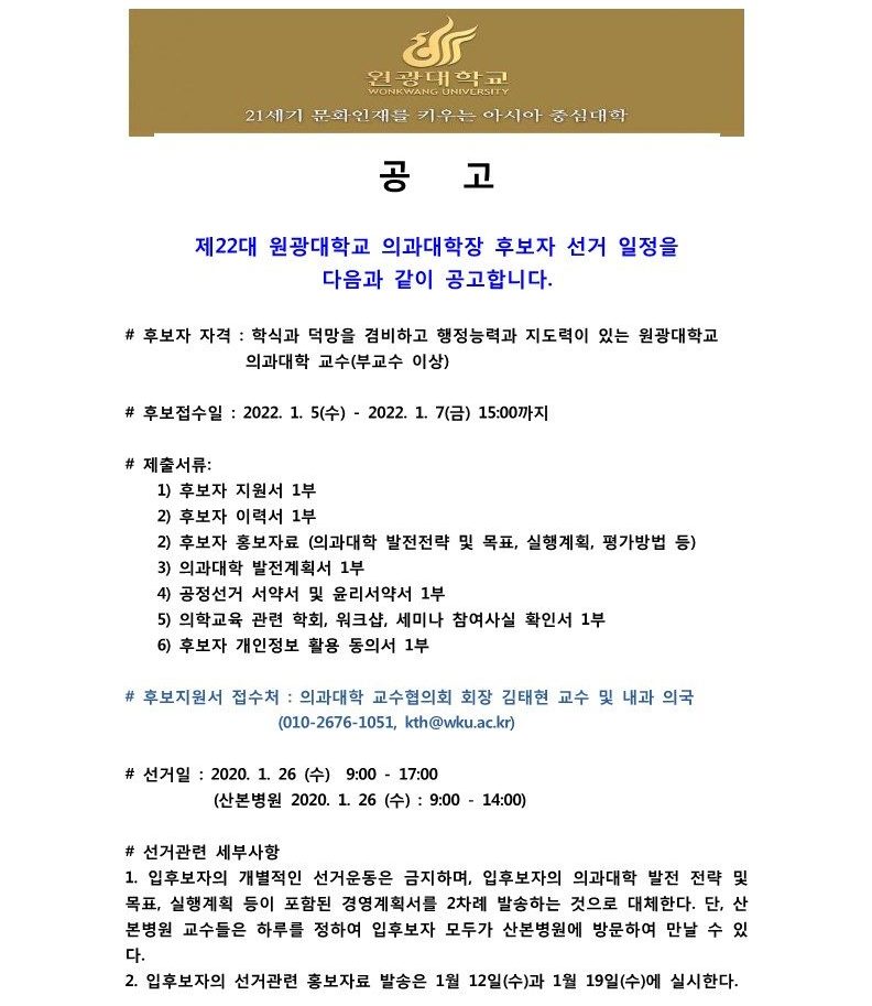 제 22대 원광대학교 의과대학장 후보자 선거 안내