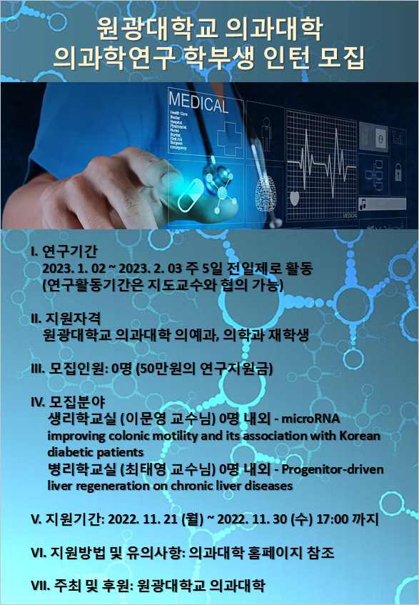 원광대학교 의과대학에서는 우수한 의예과/의학과 학부생들에게 최신 의과학 분야를 소개하고 연구를 수행하게 함으로써 4차산업 시대를 이끌어가는 우수한 전문의료인 양성을 목표로 하고 있습니다.