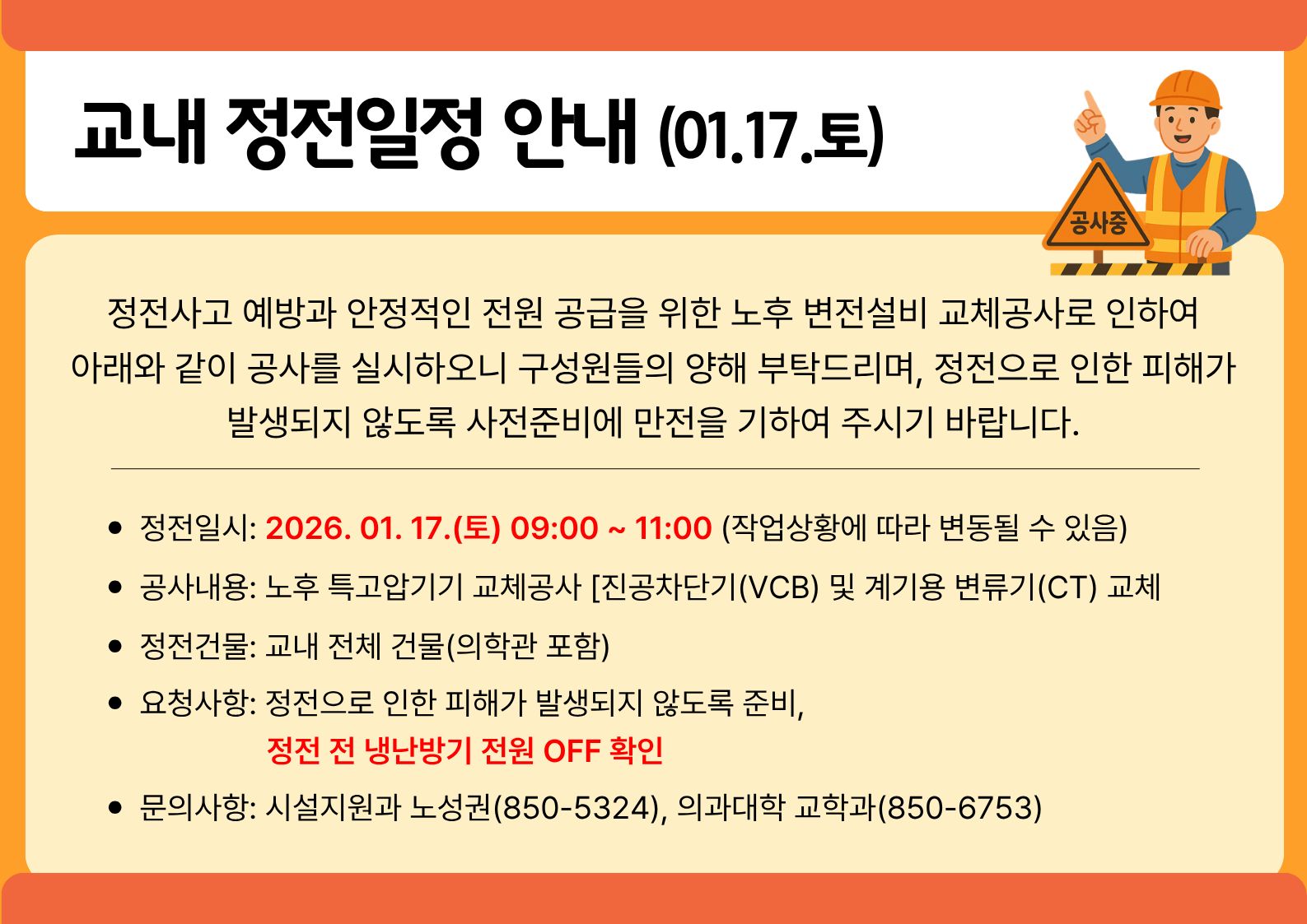 교내 정전일정 안내(01. 17.토)