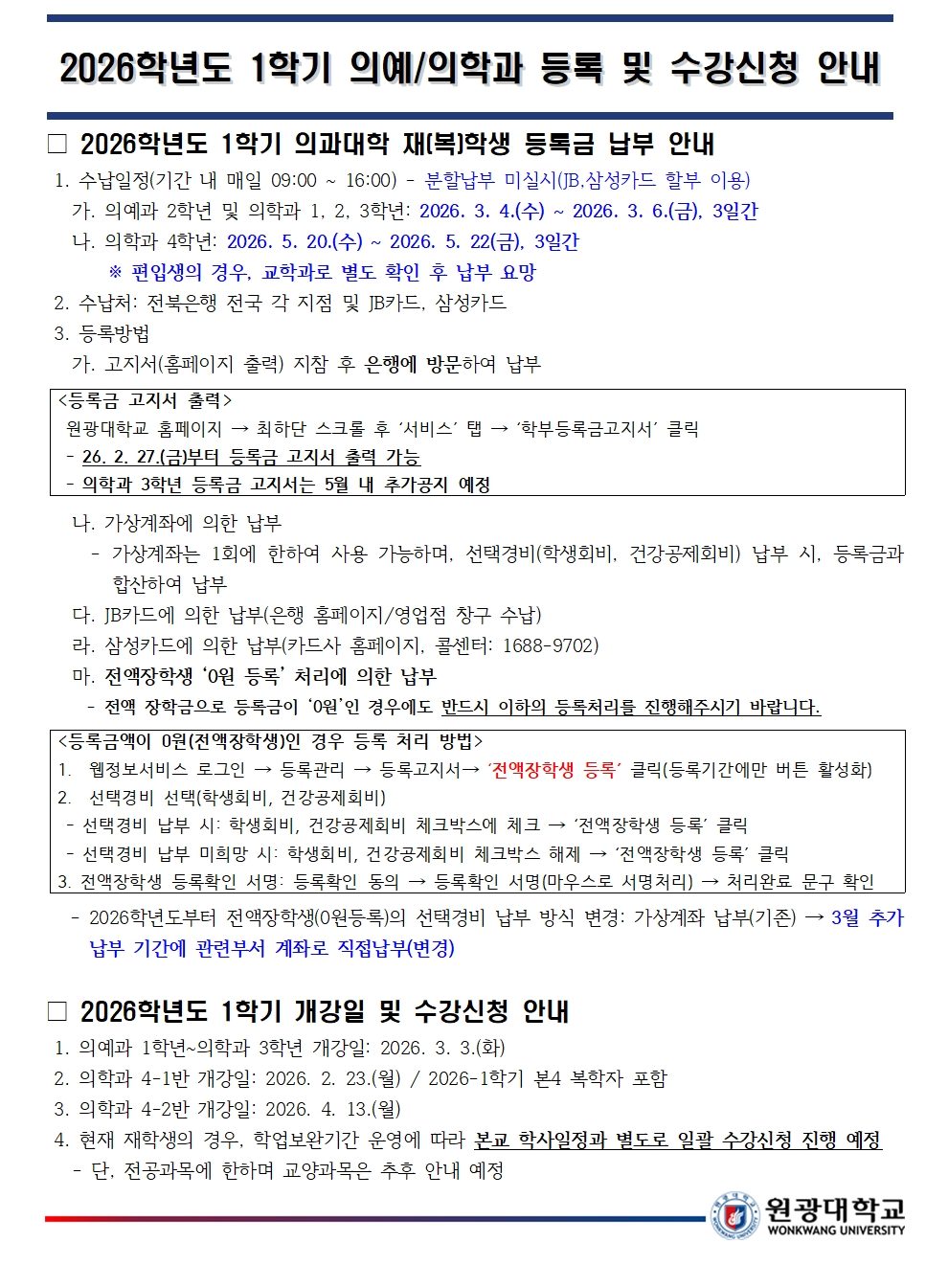 2026학년도 1학기 의예/의학과 등록 및 수강신청 안내