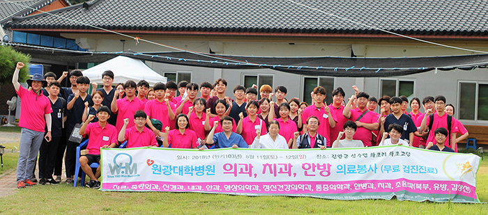 원광대학교 의과대학 의료봉사동아리 만나입니다. 1년에 한 번 재학생 전체가 도움의 손길이 필요한 곳으로 찾아가는 의료봉사 활동을 진행합니다. 봉사를 하면서 성취감을 얻을 수 있고, 선후배간의 친목도 다질 수 있습니다.